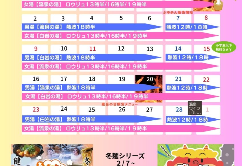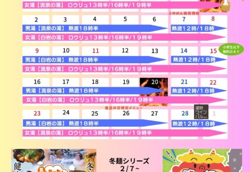 冬のあったか健康フェア 期間:12月14日(日)~2月28日(土) 今年もいよいよ冬が到来。寒いときはやっぱり温泉ですね。うるおい館の天然掛け流し温泉は保温効果がバツグン。身体を温めたあとは個性溢れるグルメで心も身体も...
