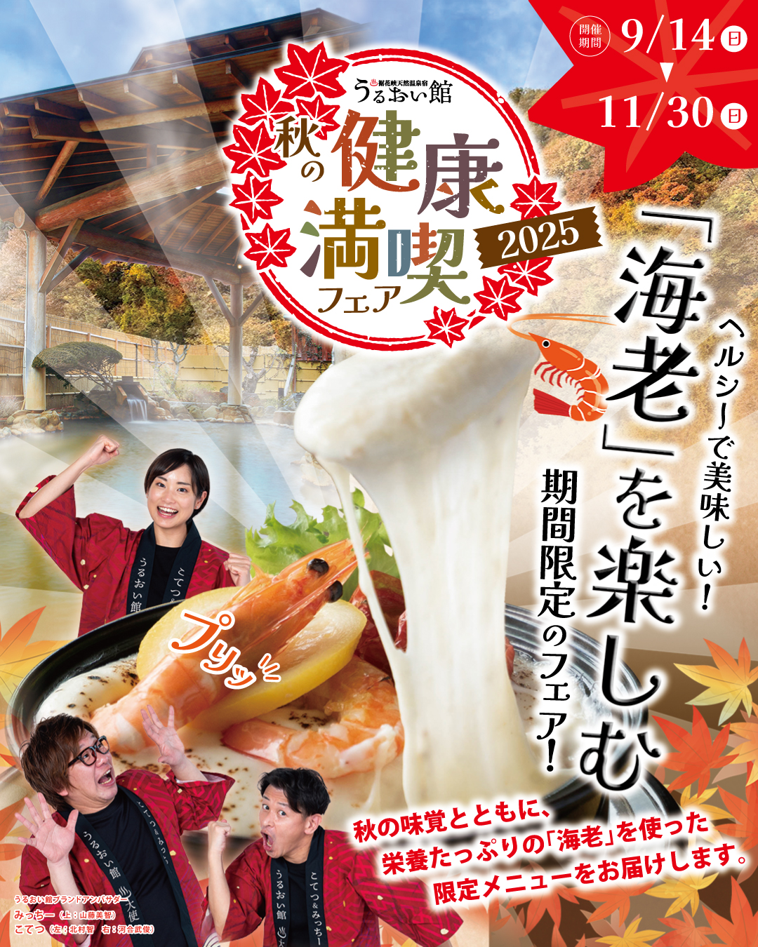 今年もうるおい館は、秋のフェアを開催します。温泉で心身をリフレッシュしながら、レストランでは「海老」を使ったメニューをご提供。
