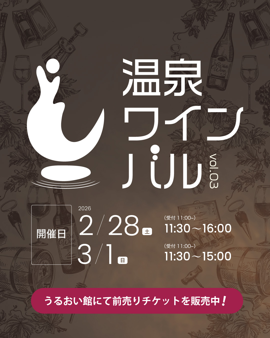 ●当イベントはワイン飲酒後のご入浴はお薦めしておりません。うるおい館でご入浴後、テラスグランツで飲食をお願いいたします。