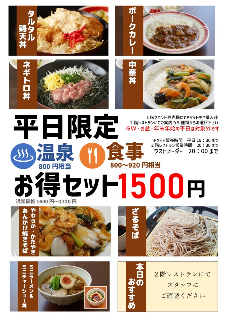 【お知らせ】大好評の平日限定『温泉&お食事セット』メニュー更新!